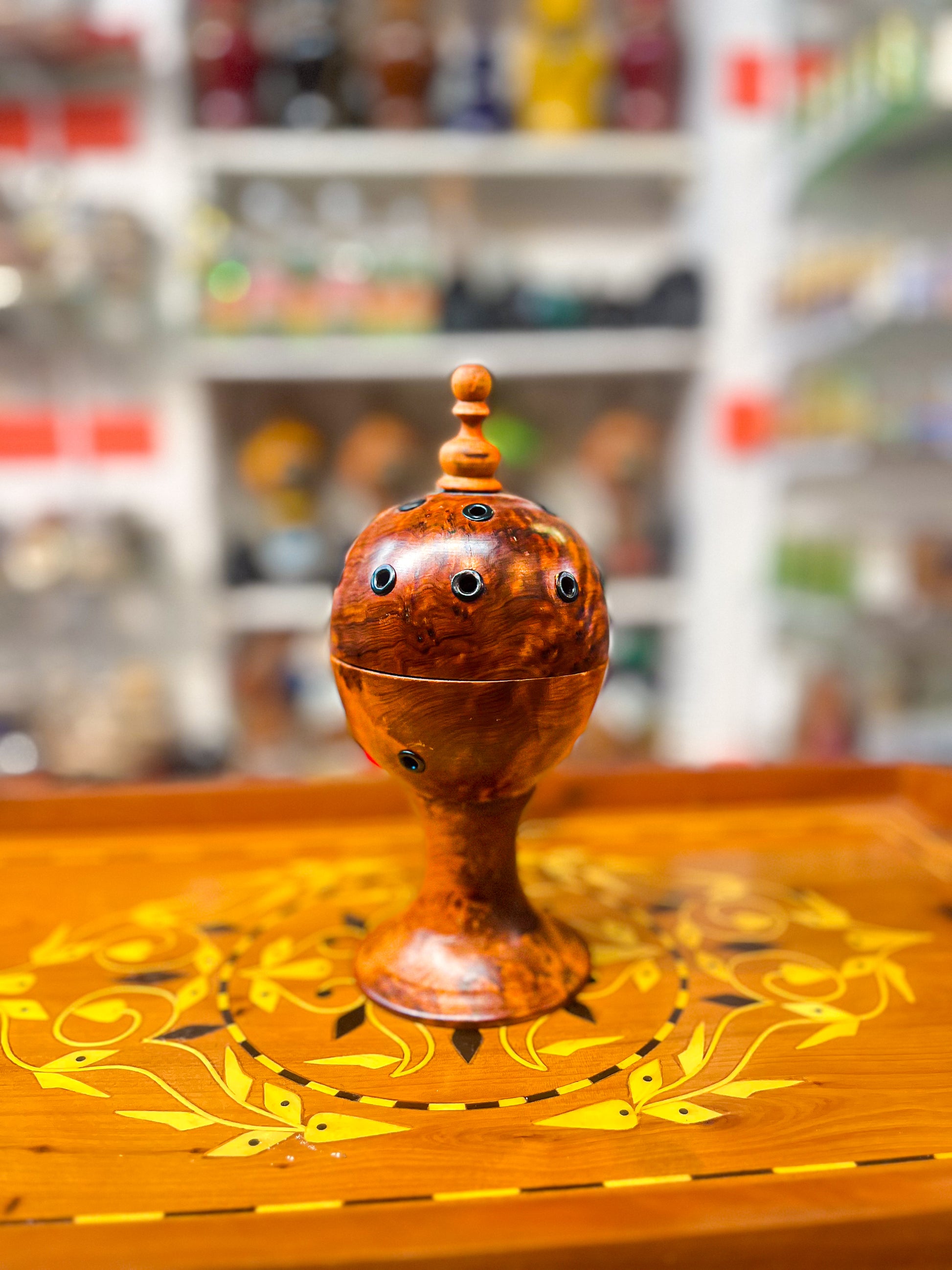 Elevate your incense rituals with this Handcrafted Wooden Mbakhara, a beautifully designed piece that blends tradition with artistry. Made from high-quality wood, this small yet striking incense burner features a unique shape that sets it apart. Its intricate craftsmanship reflects Moroccan heritage, making it both a functional and decorative item. Perfect for adding a touch of elegance to your space while enjoying the rich aromas of your favorite incense.