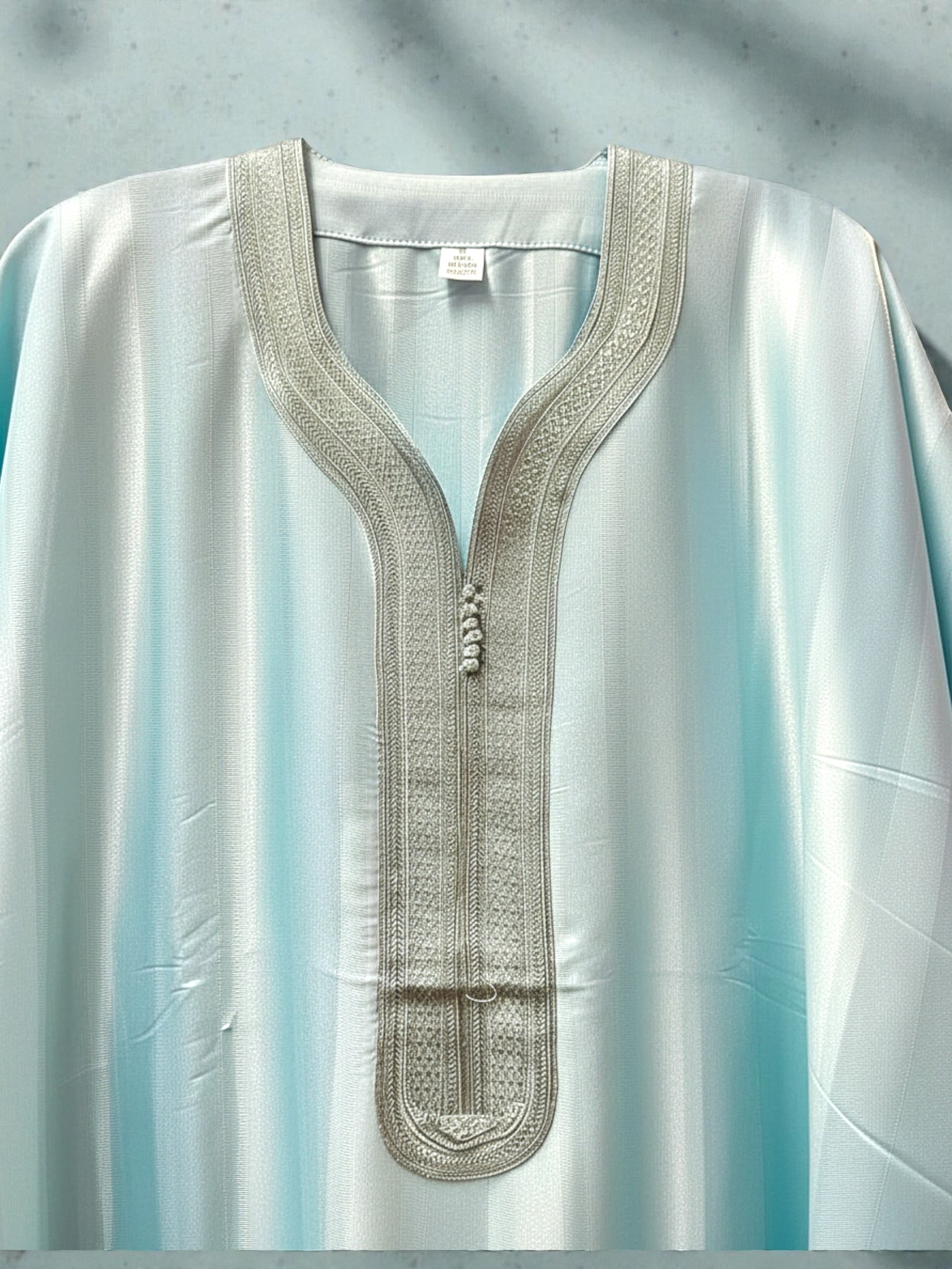Directly from the expert artisans of Morocco, this Powder Blue Foqaya is where refined style meets unparalleled comfort. This striking piece immediately demands attention with its crisp tailoring. Crafted from 100% breathable cotton, it offers a lightweight and cool feel, perfect for special occasions or elevated everyday wear. The intricate silver embroidery along the neckline contrasts beautifully with the soft Powder Blue, making this a true statement of Moroccan elegance.