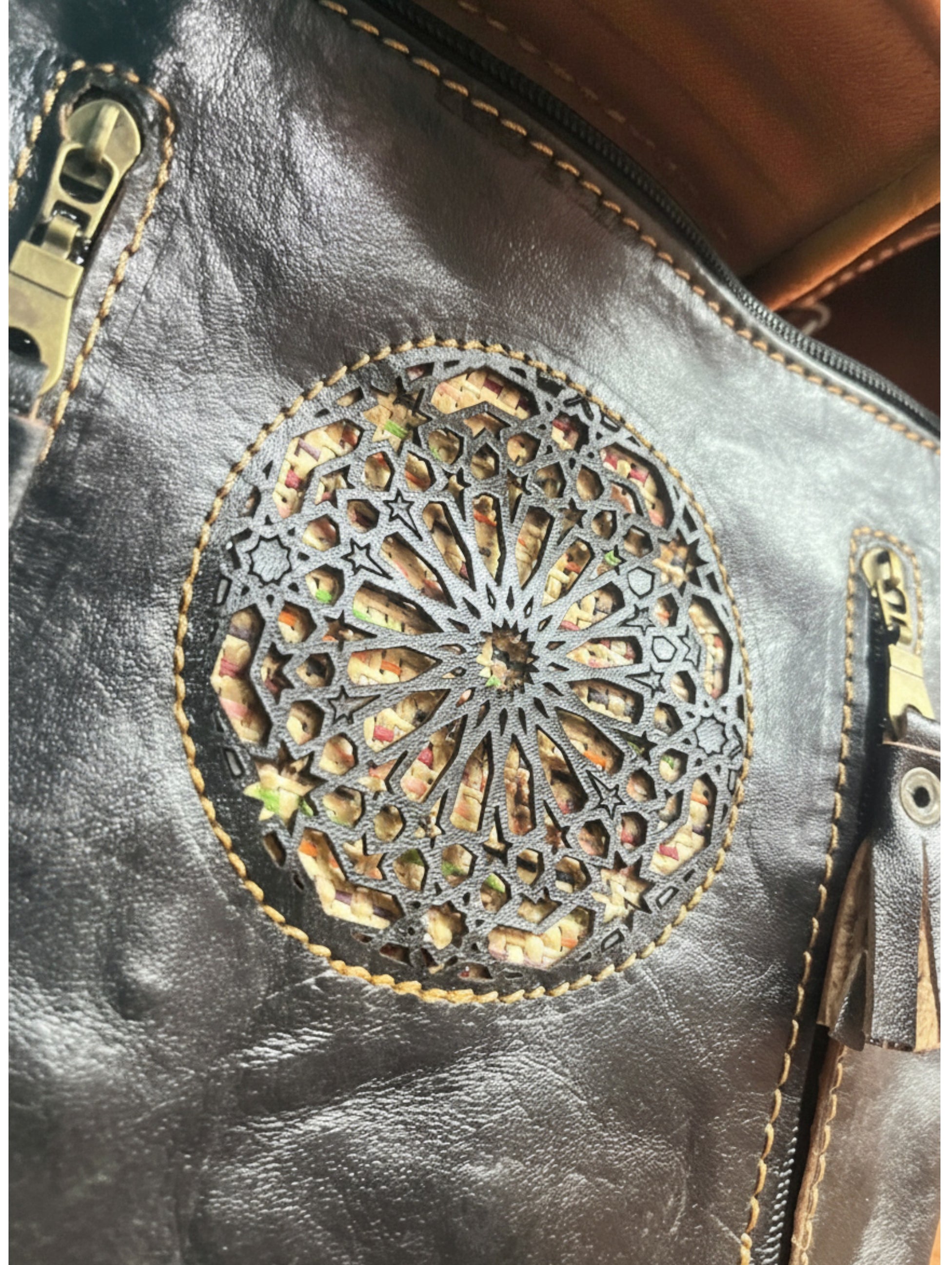 The Celestial Mandala: Features a striking, light-contrast hand-stitched pattern in the center, celebrating the intricate geometry of Moroccan craft.