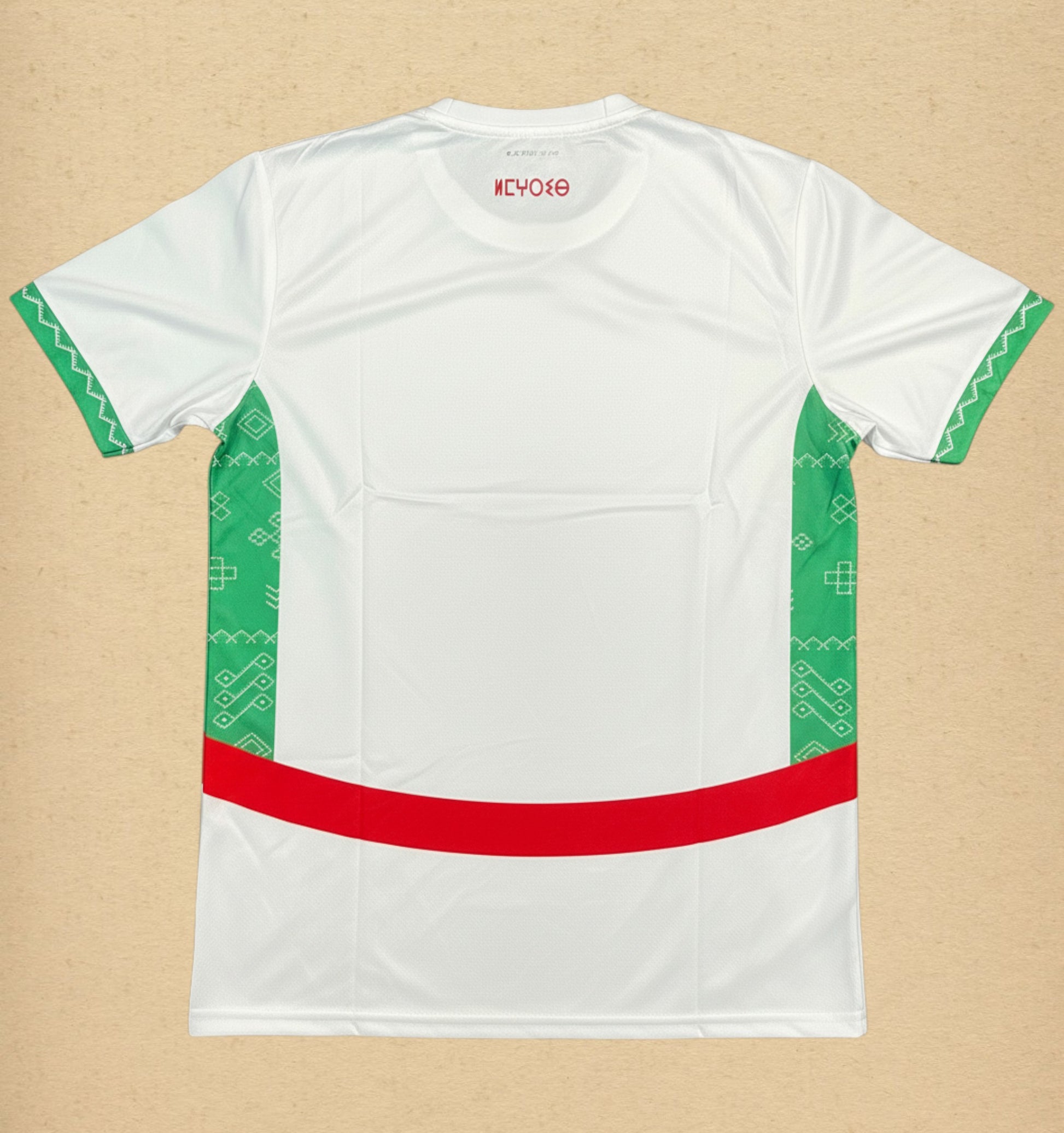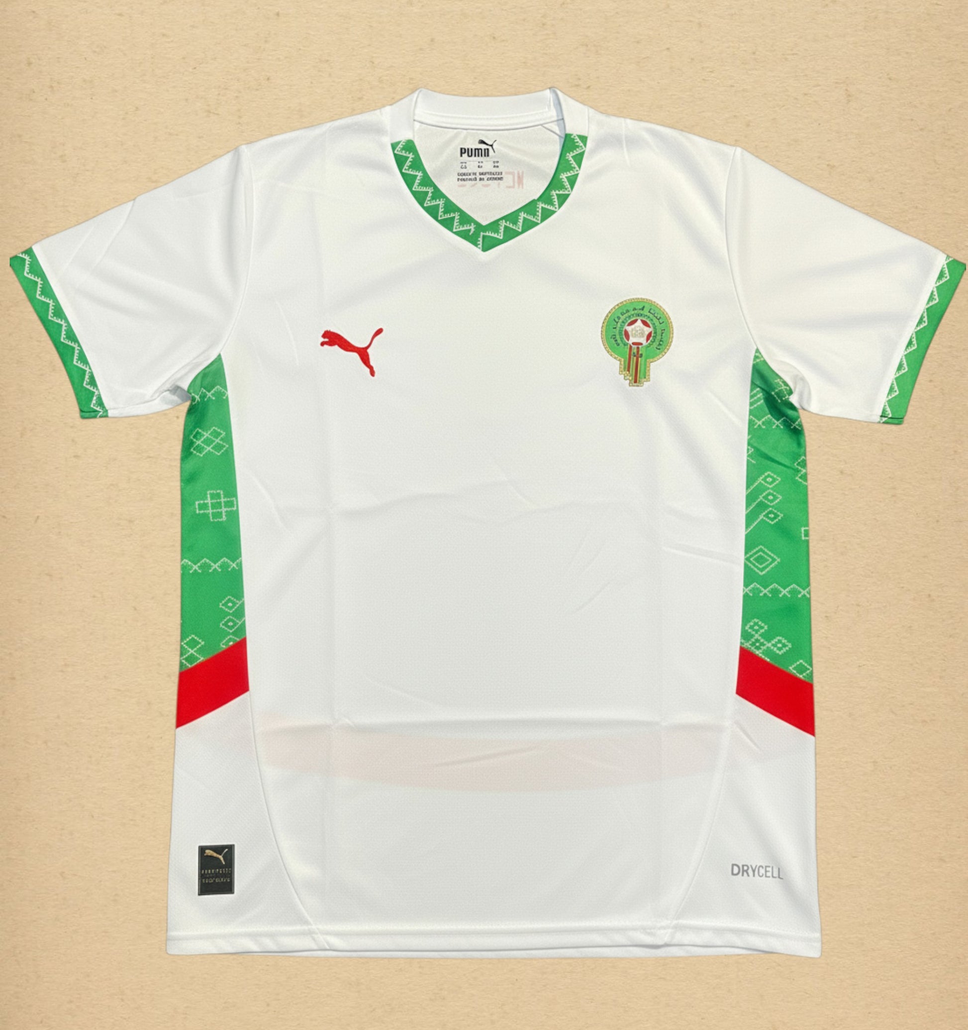 Represent the Kingdom with the White National Team Jersey, a timeless piece designed for those who carry Moroccan pride in their hearts. This jersey features a crisp white base accented by vibrant green geometric patterns inspired by the intricate beauty of traditional Moroccan zellige tilework. Engineered with high-performance DryCell technology, it is built to keep you cool and comfortable whether you’re on the pitch, in the stands, or repping your roots in your daily life.